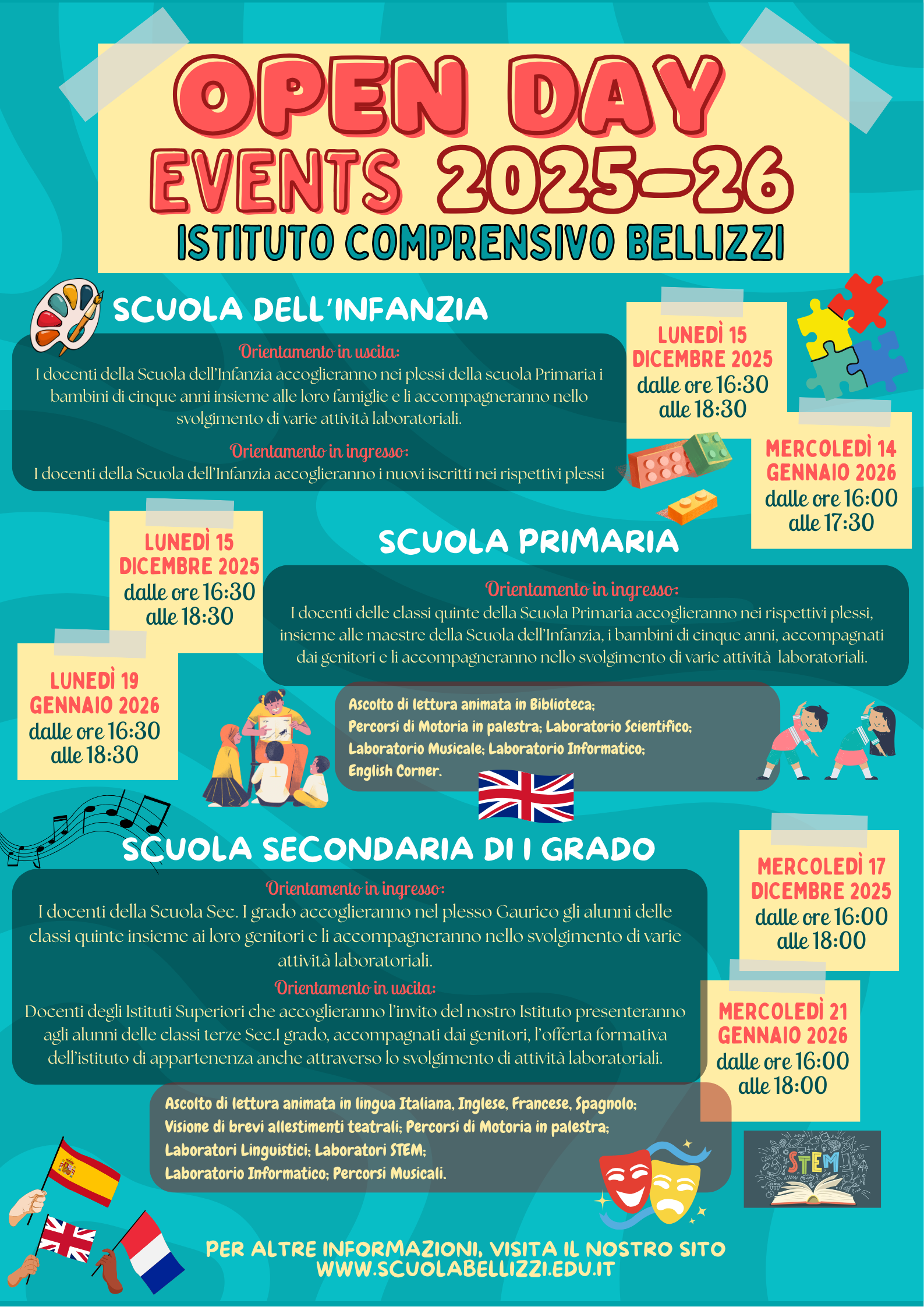 - Visite guidate: I partecipanti possono visitare i vari plessi (infanzia, primaria, secondaria di primo grado) accompagnati dal personale scolastico.